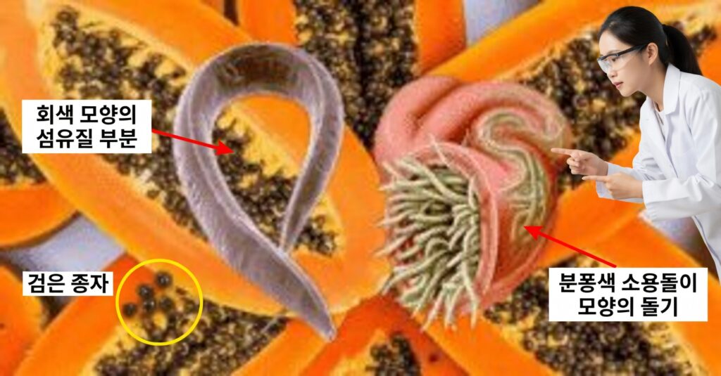 파파야 씨앗에는 **파파인(papain)**이라는 단백질 분해 효소가 들어 있습니다. 이 효소는 음식 속 단백질을 잘게 분해해 소화를 촉진할 뿐 아니라, 기생충을 이루는 단백질 구조에도 작용해 제거를 돕는 것으로 알려져 있습니다.