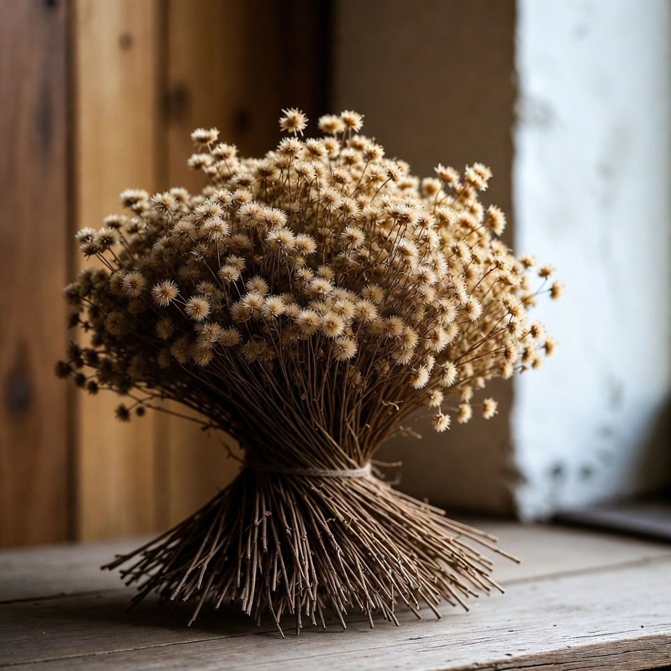 줄기 끝 부분까지 감아 올라간 뒤, 다시 아래쪽을 향해 내려오며 한 번 더 감아 주세요. - 마무리 매듭: 번들 아래쪽에서 끈을 다시 묶어 고정하고, 남는 끈은 가위로 잘라 정리합니다.