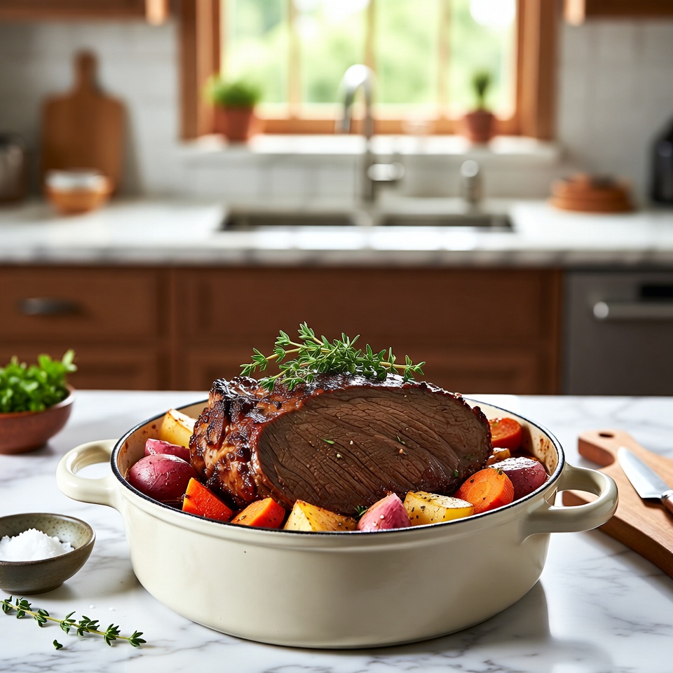 따뜻하고 든든한 클래식 포트 로스트(Classic Pot Roast) 만큼 집밥의 위로를 느끼게 해주는 음식도 드뭅니다. 소고기를 약한 불에서 천천히 익혀 부드럽게 만들고, 향긋한 채소와 진한 그레이비 소스를 곁들이는 이 요리는 가족 모임은 물론, 아늑한 저녁 식사에 딱 어울리는 정통 비프 찜 요리입니다.