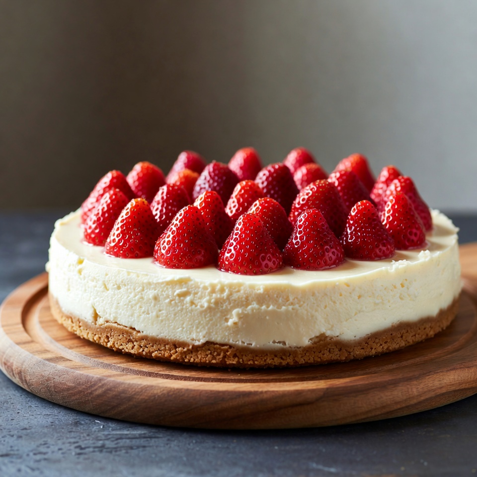 - 치즈케이크가 완전히 식은 것을 확인한 뒤, 위에 준비한 딸기 토핑을 넉넉하게 올려 고르게 펴줍니다.